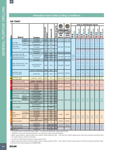 114 ISCAR GENERAL PURPOSE DRILLINGIndexable Insert Drills Cutting ConditionsDR-TWIST ISOMaterial Condition Tensile Strength [N/mm2] Hardness HB Material Group No.Feed vs. Drill Diameter mm/revDR-04 AL/DT/HDDR-05 GF/DT/AL/HDDR-06 GF/DT/AL/HDDR-07 GF/DT/AL/HDDR-09/10 GF/DT/AL/HDDR-11/12 GF/DT/AL/HDDR-14/16 GF/DT/ALCutting Speed /HD(1)Vc m/minIC808/ 908 externalVc m/minIC8080 /9080 externalPnon-alloy steel and cast steel, free cutting steel<0.25% C annealed 420 125 1 200-300 260-3900.04-0.080.02-0.060.06-0.100.10-0.150.04-0.080.07-0.120.10-0.160.04-0.080.08-0.120.12-0.180.05-0.100.10-0.150.14-0.220.05-0.100.12-0.160.15-0.250.08-0.150.14-0.170.16-0.260.08-0.15%u22650.25% C annealed 650 190 2<0.55% C quenched and tempered 850 250 3150-200 190-260%u22650.55% Cannealed 750 220 4quenched and tempered 1000 300 5 0.06-0.100.10-0.140.04-0.080.07-0.120.10-0.150.04-0.080.08-0.120.10-0.160.05-0.100.10-0.140.14-0.200.05-0.100.12-0.150.14-0.220.08-0.150.14-0.160.15-0.240.08-0.15low alloy and cast steel (less than 5% of alloying elements)annealed 600 200 6 150-220 190-290quenched and tempered930 275 71000 300 8 120-180 160-2301200 350 9high alloyed steel, cast steel and tool steelannealed 680 200 10 120-190 160-250 0.06-0.100.10-0.140.08-0.1120.06-0.100.10-0.140.08-0.1120.06-0.100.10-0.140.08-0.1120.08-0.120.12-0.180.096-0.1440.10-0.150.14-0.200.112-0.1600.14-0.170.16-0.240.128-0.192quenched and tempered 1100 325 11 100-160 210-310stainless steel and cast steelferritic / martensitic 680 200 12160-240 210-3100.06-0.100.048-0.080.06-0.100.048-0.080.06-0.120.048-0.0960.08-0.120.064-0.0960.10-0.140.08-0.1120.12-0.200.096-0.160martensitic 820 240 13M stainless steel and cast steel austenitic, duplex 600 180 14 160-240 210-310 0.04-0.080.06-0.100.06-0.100.06-0.120.08-0.120.10-0.140.12-0.20Kgray cast iron (GG) ferritic / pearlitic 180 15 150-250 190-3200.08-0.160.10-0.220.10-0.220.10-0.220.15-0.250.18-0.300.20-0.34pearlitic / martensitic 260 16nodular cast iron (GGG) ferritic 160 17120-180 160-230 pearlitic 250 18malleable cast iron ferritic 130 19pearlitic 230 20Naluminum-wrought alloys not hardenable 60 21150-300 190-390 0.08-0.240.12-0.250.12-0.250.12-0.250.20-0.300.2-0.350.28-0.45hardenable 100 22aluminumcast alloys%u226412% Si not hardenable 75 23hardenable 90 24>12% Si high temperature 130 25copper alloys>1% Pb free cutting 110 26brass 90 27electrolytic copper 100 28non metallicduroplastics, fiber plastics70Shore D 29hard rubber 55Shore D 30Shigh temperature alloysFe based annealed 200 3120-50 30-600.03-0.070.04-0.080.04-0.080.05-0.090.07-0.100.08-0.120.10-0.14hardened 280 32Ni or Co basedannealed 250 33hardened 350 34cast 320 35titanium alloyspure 400 190 36alpha+beta alloys, 50-60 60-80hardened 1050 310 37Hhardened steel hardened 55 HRC 38 20-50 30-60 0.04-0.080.05-0.080.05-0.080.06-0.090.07-0.100.08-0.120.10-0.14hardened 60 HRC 39chilled cast iron cast 400 40cast iron hardened 55 HRC 41%u2022 This table refers to 2/3xD drill ratio usage. %u2022 For 4xD ratio decrease cutting data by 15% %u2022 Chipformer should be selected based on our geometry range recommendations %u2022 When using external coolant supply only, reduce cutting speed by 10% %u2022 Use internal coolant supply when machining austenitic stainless steel %u2022 This table refers to 2/3xD drill lengths. %u2022 For 4xD and 5XD drills, decrease cutting data by 15% %u2022 When using only external coolant supply, reduce cutting speed by 10% %u2022 Use internal coolant supply when machining austenitic stainless steel (1) Central insert should always be IC808/IC908