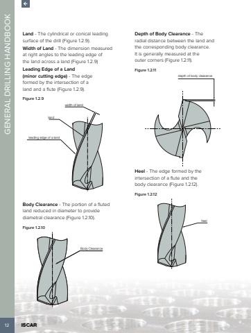 12 ISCAR GENERAL DRILLING HANDBOOKLand - The cylindrical or conical leading surface of the drill (Figure 1.2.9).Width of Land - The dimension measured at right angles to the leading edge of the land across a land (Figure 1.2.9)Leading Edge of a Land (minor cutting edge) - The edge formed by the intersection of a land and a flute (Figure 1.2.9).Figure 1.2.9leading edge of a land width of land land Body Clearance - The portion of a fluted land reduced in diameter to provide diametral clearance (Figure 1.2.10).Figure 1.2.10Body Clearance Depth of Body Clearance - The radial distance between the land and the corresponding body clearance. It is generally measured at the outer corners (Figure 1.2.11).Figure 1.2.11depth of body clearance Heel - The edge formed by the intersection of a flute and the body clearance (Figure 1.2.12).Figure 1.2.12heel