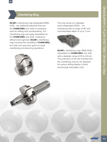 165PRE-THREAD DRILLING WITH CHAMFERING %u00bd%u0009Chamfering RingISCAR%u2019s chamfering rings designated RING DCM%u2026 are additional elements that turn the CHAM-DRILL line drills to combined tools for drilling and countersinking. The chamfering rings are easily assembled on the CHAM-DRILL line drills, creating an efficient and rigid tool. ISCAR%u2019s chamfering rings increase the versatility of CHAM-DRILLline drills and save time spent on small chamfering and deburring operations.The ring carries an indexable insert designated XOGX %u2026 for chamfering with an angle of 45%u00b0 and recommended depth of up to 2 mm. ISCAR%u2019s chamfering rings, RING DCM%u2026, assembled on CHAM-DRILL line drills with a diameter range of 10 to 20 mm. The protrusion of the drill inserted into the chamfering ring can be adjusted for various drilling depths in blind and through hole (table 3.4.1).