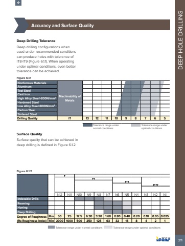 211DEEP HOLE DRILLING%u00bd%u0009Accuracy and Surface QualityDeep Drilling ToleranceDeep drilling configurations when used under recommended conditions can produce holes with tolerance of IT8-IT9 (Figure 6.1.1). When operating under optimal conditions, even better tolerance can be achieved.Figure 6.1.2N12 N11 N10 N9 N8 N7 N6 N5 N4 N3 N2 N1Indexable DrillsReamingHoningDeep DrillingDegree of Roughness (Ra Roughness Index)%u039cm 50 25 12.5 6.30 3.20 1.60 0.80 0.40 0.20 0.10 0.05 0.025%u039cin 2000 1000 500 250 125 63 32 16 8 4 2 1Tolerance range under normal conditions Tolerance range under optimal conditionsSurface QualitySurface quality that can be achieved in deep drilling is defined in Figure 6.1.2.Figure 6.1.1Nonferrous MaterialsMachinability of MetalsAluminumTool SteelCast IronHigh Alloy Steel>800N/mm2Hardened SteelLow Alloy Steel<800N/mm2Carbon SteelSintered SteelDrilling Quality IT 13 12 11 10 9 8 7 6 5Tolerance range under normal conditionsTolerance range under optimal conditions