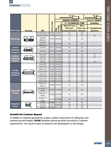 229DEEP HOLE DRILLINGDriver Type Drawing DXL Driver CodeF FBRAZED GUNDRILL SOLID CARBIDE GUNDRILLMax.CuttingDiameterF = CYLINDRICAL TUBEEqual Or LessThan max.Cutting DiameterMoreThan max.DiameterF = StraighteningExtensionVDI DesignLD M10x68 M6x0.5 N%u00b068 6.749 10 2016x90 M10x1 N%u00b069 10.799 10 20 1525x112 M16x1.5 N%u00b070 19.509 10 2536x135 M24x1.5 N%u00b071 30.609 10 25Central Clamping HexagonalLD25x70 N%u00b072 19.509 10 2532x70 N%u00b073 25.609 10 25Central Clamping TaperedL .50x1.50%u201d N%u00b074 8.599 10 20 1516x70 N%u00b075 12.099 10 20 15.75x2.75%u201d N%u00b076 14.099 10 2020x70 N%u00b077 16.099 10 20 15Frontal Clamping Surface 2%u00b0LD.50x1.50%u201d N%u00b078 9.699 10 20.75x2.75%u201d N%u00b079 14.899 10 201.00x2.75%u201d N%u00b080 19.509 10 251.00x3.94%u201d N%u00b081 19.509 10 251.25x2.75%u201d N%u00b082 25.609 10 251.25x3.94%u201d N%u00b083 25.609 10 251.50x2.75%u201d N%u00b084 32.609 10 251.50x3.94%u201d N%u00b085 32.609 10 25Trapezoidal ThreadLTr D16x112 Tr 16x1.5 N%u00b086 13.599 10 2020x126 Tr 20x2 N%u00b087 17.099 10 2028x126 Tr 28x2 N%u00b088 25.599 10 2536x162 Tr 36x2 N%u00b089 32.599 10 25Spraymist DriverLD16x40 N%u00b090 12.399 10 2025x50 N%u00b091 19.509 10 2535x60 N%u00b092 26.599 10 25Gundrills Per Customer RequestIn addition to standard geometries, shapes, profiles, dimensions of cutting tips, and standard gundrill lengths, ISCAR develops special gundrills according to customer requirements - the result of years of research and development in tool design.Driver Type Drawing DXL Driver CodeF FBRAZED GUNDRILL SOLID CARBIDE GUNDRILLMax.CuttingDiameterF = CYLINDRICAL TUBEEqual Or LessThan max.Cutting DiameterMoreThan max.DiameterF = StraighteningExtensionVDI DesignLD M10x68 M6x0.5 N%u00b068 6.749 10 2016x90 M10x1 N%u00b069 10.799 10 20 1525x112 M16x1.5 N%u00b070 19.509 10 2536x135 M24x1.5 N%u00b071 30.609 10 25Central Clamping HexagonalLD25x70 N%u00b072 19.509 10 2532x70 N%u00b073 25.609 10 25Central Clamping TaperedL .50x1.50%u201d N%u00b074 8.599 10 20 1516x70 N%u00b075 12.099 10 20 15.75x2.75%u201d N%u00b076 14.099 10 2020x70 N%u00b077 16.099 10 20 15Frontal Clamping Surface 2%u00b0LD.50x1.50%u201d N%u00b078 9.699 10 20.75x2.75%u201d N%u00b079 14.899 10 201.00x2.75%u201d N%u00b080 19.509 10 251.00x3.94%u201d N%u00b081 19.509 10 251.25x2.75%u201d N%u00b082 25.609 10 251.25x3.94%u201d N%u00b083 25.609 10 251.50x2.75%u201d N%u00b084 32.609 10 251.50x3.94%u201d N%u00b085 32.609 10 25Trapezoidal ThreadLTr D16x112 Tr 16x1.5 N%u00b086 13.599 10 2020x126 Tr 20x2 N%u00b087 17.099 10 2028x126 Tr 28x2 N%u00b088 25.599 10 2536x162 Tr 36x2 N%u00b089 32.599 10 25Spraymist DriverLD16x40 N%u00b090 12.399 10 2025x50 N%u00b091 19.509 10 2535x60 N%u00b092 26.599 10 25Gundrills Per Customer RequestIn addition to standard geometries, shapes, profiles, dimensions of cutting tips, and standard gundrill lengths, ISCAR develops special gundrills according to customer requirements - the result of years of research and development in tool design.Continued