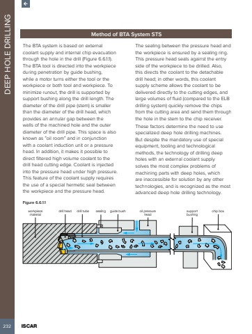 232 ISCAR DEEP HOLE DRILLINGMethod of BTA System STSThe BTA system is based on external coolant supply and internal chip evacuation through the hole in the drill (Figure 6.6.1.1). The BTA tool is directed into the workpiece during penetration by guide bushing, while a motor turns either the tool or the workpiece or both tool and workpiece. To minimize runout, the drill is supported by support bushing along the drill length. The diameter of the drill pipe (stem) is smaller than the diameter of the drill head, which provides an annular gap between the walls of the machined hole and the outer diameter of the drill pipe. This space is also known as %u201coil room%u201d and in conjunction with a coolant induction unit or a pressure head. In addition, it makes it possible to direct filtered high volume coolant to the drill head cutting edge. Coolant is injected into the pressure head under high pressure. This feature of the coolant supply requires the use of a special hermetic seal between the workpiece and the pressure head. The sealing between the pressure head and the workpiece is ensured by a sealing ring. This pressure head seals against the entry side of the workpiece to be drilled. Also, this directs the coolant to the detachable drill head; in other words, this coolant supply scheme allows the coolant to be delivered directly to the cutting edges, and large volumes of fluid (compared to the ELB drilling system) quickly remove the chips from the cutting area and send them through the hole in the stem to the chip receiver.These factors determine the need to use specialized deep hole drilling machines. But despite the mandatory use of special equipment, tooling and technological methods, the technology of drilling deep holes with an external coolant supply solves the most complex problems of machining parts with deep holes, which are inaccessible for solution by any other technologies, and is recognized as the most advanced deep hole drilling technology.Figure 6.6.1.1workpiece drill head chip boxmaterialdrill tube sealing guide bush oil pressure headsupport bushing