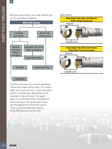 234 ISCAR DEEP HOLE DRILLINGBTA drill head designs are quite diverse and can be classified as follows: BTA Drill HeadsIndexableInsert DrillsBrazed TipsDrilling HeadModular Drill Head (WithoutCartridges)Adjustable Drill Head(With Cartridges)ISCAR-DEEP-DRILLTRI-DEEP ISCAR-DEEP-DRILLFINE-BEAMThe BTA drill head has a hollow cylindrical shape with single cutting edge. The cutting edge can consist of one or more indexable inserts or brazed tips, depending on the diameter of the drill head. The guide pads are positioned at the circumference of the drill head. The guide pads brace the tool against the machined surface, which is another distinctive feature of the BTA process and the tool.Figure 6.6.2.2Deep Single Tube Drills with External 4-Start Thread ConnectionIndexable insertGude padDeep Single Tube Drills with InternalSingle-Start Thread ConnectionIndexable insertGude pad