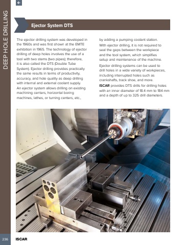 236 ISCAR DEEP HOLE DRILLING %u00bd%u0009Ejector System DTSThe ejector drilling system was developed in the 1960s and was first shown at the EMTE exhibition in 1965. The technology of ejector drilling of deep holes involves the use of a tool with two stems (two pipes); therefore, it is also called the DTS (Double Tube System). Ejector drilling provides practically the same results in terms of productivity, accuracy, and hole quality as deep drilling with internal and external coolant supply. An ejector system allows drilling on existing machining centers, horizontal boring machines, lathes, or turning centers, etc., by adding a pumping coolant station. With ejector drilling, it is not required to seal the gaps between the workpiece and the tool system, which simplifies setup and maintenance of the machine.Ejector drilling systems can be used to drill holes in a wide variety of workpieces, including interrupted holes such as crankshafts, track shoe, and more.ISCAR provides DTS drills for drilling holes with an inner diameter of 18.4 mm to 184 mm and a depth of up to 325 drill diameters.