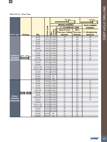 253DEEP HOLE DRILLINGTable 6.11.2.4 %u2013 Driver TypeDriver Type Drawing DXL Driver CodeF FBRAZED GUNDRILL SOLID CARBIDE GUNDRILLMax.CuttingDiameterF = CYLINDRICAL TUBEEqual Or LessThan max. CuttingDiameterMoreThan max.DiameterF = StraighteningExtensionCylindrical DIN1835A DIN6535HALD4x28 N%u00b01 2.749 10 20 185x28 N%u00b02 3.249 10 20 156x36 N%u00b03 4.249 10 20 148x36 N%u00b04 5.749 10 20 1410x40 N%u00b05 7.299 10 20 1512x45 N%u00b06 8.999 10 20 15.50x1.78%u201d N%u00b094 9.699 10 20 1514x45 N%u00b07 10.999 10 20 1516x48 N%u00b08 12.399 10 20 1518x48 N%u00b09 14.399 10 20 15.75x2.03%u201d N%u00b095 14.899 10 20 1520x50 N%u00b010 15.899 10 2025x56 N%u00b011 19.509 10 251.00x2.28%u201d N%u00b096 19.509 10 251.25x2.28%u201d N%u00b097 25.609 10 2532x60 N%u00b012 25.609 10 2540x70 N%u00b013 32.609 10 2550x80 N%u00b014 40 10 2563x90 N%u00b015 40 10 25Weldon DIN1835B DIN6535HBLDLD6x36 N%u00b016 2.749 10 20 158x36 N%u00b017 3.249 10 20 1510x40 N%u00b018 7.299 10 20 1512x45 N%u00b019 8.999 10 20 15.50x1.78%u201d N%u00b098 9.699 10 20 1516x48 N%u00b020 12.399 10 20 1518x48 N%u00b021 14.399 10 20 15.75x2.03%u201d N%u00b099 14.899 10 20 1520x50 N%u00b022 15.899 10 20 1525x56 N%u00b023 19.509 10 251.00x2.28%u201d N%u00b0100 19.509 10 251.25x2.28%u201d N%u00b0101 25.609 10 2532x60 N%u00b024 25.609 10 2540x70 N%u00b025 32.609 10 2550x80 N%u00b026 40 10 2563x90 N%u00b027 40 10 25