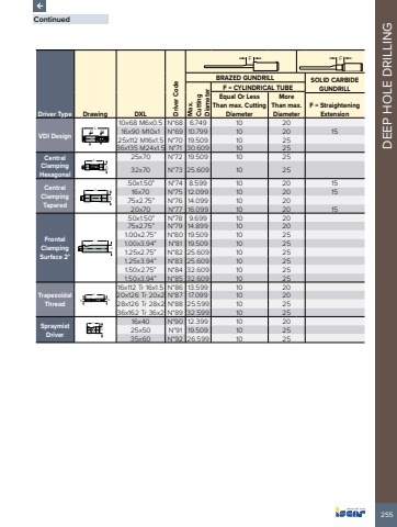255DEEP HOLE DRILLINGDriver Type Drawing DXL Driver CodeF FBRAZED GUNDRILL SOLID CARBIDE GUNDRILLMax.CuttingDiameterF = CYLINDRICAL TUBEEqual Or LessThan max. CuttingDiameterMoreThan max.DiameterF = StraighteningExtensionVDI DesignL D M10x68 M6x0.5 N%u00b068 6.749 10 2016x90 M10x1 N%u00b069 10.799 10 20 1525x112 M16x1.5 N%u00b070 19.509 10 2536x135 M24x1.5 N%u00b071 30.609 10 25Central Clamping HexagonalLD25x70 N%u00b072 19.509 10 2532x70 N%u00b073 25.609 10 25Central Clamping TaperedL.50x1.50%u201d N%u00b074 8.599 10 20 1516x70 N%u00b075 12.099 10 20 15.75x2.75%u201d N%u00b076 14.099 10 2020x70 N%u00b077 16.099 10 20 15Frontal Clamping Surface 2%u00b0LD.50x1.50%u201d N%u00b078 9.699 10 20.75x2.75%u201d N%u00b079 14.899 10 201.00x2.75%u201d N%u00b080 19.509 10 251.00x3.94%u201d N%u00b081 19.509 10 251.25x2.75%u201d N%u00b082 25.609 10 251.25x3.94%u201d N%u00b083 25.609 10 251.50x2.75%u201d N%u00b084 32.609 10 251.50x3.94%u201d N%u00b085 32.609 10 25Trapezoidal ThreadLTr D16x112 Tr 16x1.5 N%u00b086 13.599 10 2020x126 Tr 20x2 N%u00b087 17.099 10 2028x126 Tr 28x2 N%u00b088 25.599 10 2536x162 Tr 36x2 N%u00b089 32.599 10 25Spraymist DriverLD16x40 N%u00b090 12.399 10 2025x50 N%u00b091 19.509 10 2535x60 N%u00b092 26.599 10 25Continued