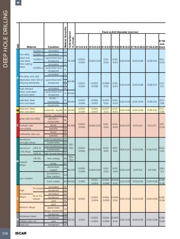 258 ISCAR DEEP HOLE DRILLING ISOMaterial Condition Material Group No. Cutting SpeedVc [m/minFeed vs.Drill Diameter [mm/rev]D=2.0-2.5 D=2.5-3.5 D=3.5-5 D=5-8 D=8-12.5 D=12.5-22.5 D=22.5-30D=30 and morePnon-alloy steel and cast steel, free cutting steel<0.25% C annealed 170-100 0.002-0.003 0.003-0.01 0.01-0.020.02-0.03 0.03-0.05 0.05-0.08 0.08-0.13 0.13-0.23%u22650.25% C annealed 2<0.55% C quenched and tempered 3%u22650.55% Cannealed 4quenched and tempered 5low alloy and cast steel (less than 5% of alloying elements)annealed 660-800.002-0.0030.003-0.0080.008-0.020.02-0.03 0.03-0.05 0.05-0.08 0.08-0.12 0.12-0.2quenched and tempered789high alloyed steel, cast steel and tool steelannealed 10quenched and tempered 11 40-60stainless steel and cast steelferritic / martensitic 1240-60 0.003-0.0040.004-0.0070.007-0.020.02-0.03 0.03-0.05 0.05-0.09 0.09-0.13 0.13-0.18martensitic 13M stainless steel and cast steel austenitic, duplex 14 30-60 0.003-0.0040.004-0.0070.007-0.020.02-0.03 0.03-0.05 0.05-0.09 0.09-0.13 0.13-0.18Kgray cast iron (GG) ferritic / pearlitic 1570-100 0.002-0.003 0.003-0.01 0.01-0.020.02-0.04 0.04-0.07 0.07-0.12 0.12-0.17 0.17-0.29pearlitic / martensitic 16nodular cast iron (GGG)ferritic 17pearlitic 18malleable cast ironferritic 19pearlitic 20Naluminumwrought alloysnot hardenable 21100-150 0.002-0.003 0.003-0.02 0.02-0.070.07-0.13 0.13-0.23 0.23-0.36 0.36-0.52 0.52-1.00hardenable 22aluminumcast alloys%u226412% Sinot hardenable 23hardenable 24>12% Si high temperature 25copper alloys>1% Pb free cutting 26 100-150brass 2780-120 0.003-0.004 0.004-0.01 0.01-0.020.02-0.04 0.04-0.07 0.07-0.11 0.11-0.16 0.16-0.3electrolytic copper28non metallicduroplastics, fiber plastics 29hard rubber 30 40-60 0.002 0.002-0.0040.004-0.0090.009-0.02 0.02-0.03 0.03-0.05 0.05-0.08 0.08-0.09Shigh temperature alloysFe basedannealed 3125-50 0.002 0.002-0.0040.004-0.0090.009-0.02 0.02-0.03 0.03-0.05 0.05-0.08 0.08-0.09hardened 32Ni or Co basedannealed 33hardened 34cast 35titanium alloyspure 36alpha+beta alloys, hardened 37Hhardened steelhardened 3825-50 0.002 0.002-0.0040.004-0.0090.009-0.02 0.02-0.03 0.03-0.05 0.05-0.08 0.08-0.09hardened 39chilled cast iron cast 40cast iron hardened 41