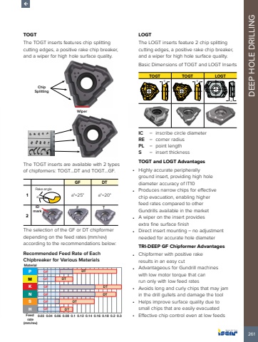 261DEEP HOLE DRILLINGTOGTThe TOGT inserts features chip splitting cutting edges, a positive rake chip breaker, and a wiper for high hole surface quality.WiperChip SplittingThe TOGT inserts are available with 2 types of chipformers: TOGT%u2026DT and TOGT%u2026GF.GF DT1 a%u02daRake anglea%u00b0=25%u00b0 a%u00b0=20%u00b02ID markF TThe selection of the GF or DT chipformer depending on the feed rates (mm/rev) according to the recommendations beloRecommended Feed Rate of EachChipbreaker for Various MaterialsMaterialFeed rate(mm/rev)PMKNSHGF DTGFGFDTDTDTDTGFGFGFDT0.03 0.04 0.06 0.08 0.1 0.12 0.14 0.16 0.18 0.2 0.3LOGTThe LOGT inserts feature 2 chip splitting cutting edges, a positive rake chip breaker, and a wiper for high hole surface quality.Basic Dimensions of TOGT and LOGT InsertsTOGT TOGT LOGTS SSIC %u2013 inscribe circle diameterRE %u2013 corner radiusPL %u2013 point lengthS %u2013 insert thicknessTOGT and LOGT Advantages%u2022 Highly accurate peripherally ground insert, providing high hole diameter accuracy of IT10%u2022 Produces narrow chips for effective chip evacuation, enabling higher feed rates compared to other Gundrills available in the market%u2022 A wiper on the insert provides extra fine surface finish%u2022 Direct insert mounting %u2013 no adjustment needed for accurate hole diameterTRI-DEEP GF Chipformer Advantages%u2022 Chipformer with positive rake results in an easy cut%u2022 Advantageous for Gundrill machines with low motor torque that can run only with low feed rates%u2022 Avoids long and curly chips that may jam in the drill gullets and damage the tool%u2022 Helps improve surface quality due to small chips that are easily evacuated%u2022 Effective chip control even at low feeds