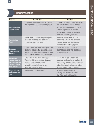 303DEEP HOLE DRILLING%u00bd%u0009TroubleshootingProblem Possible Cause SolutionThe Drill BreaksOr Insert Chips%u2022 Chip evacuation problems. Center misalignment of drill to workpiece. %u2022 Check that the coolant passages are clear and that the Venturi slots are not damaged. Check center alignment of drill to workpiece. Check workpiece and drill clamping rigidity. Poor SurfaceFinish%u2022 Workpiece or drill clamping rigidity problem. Inadequate coolant oil. Cutting speed too low. %u2022 Improve workpiece or drill clamping. Check the coolant oil and replace if necessary. Increase the cutting speed. ExcessiveLeakage of theCoolant%u2022 Chips block the fluid passages. The drill was incorrectly assembled, or the Venturi slots of the internal tube are located in the wrong direction. %u2022 Clear the chips. Check all connections and the direction of the internal tube. InsufficientCoolant Flow At the Cutting Zone,Despite CorrectFluid Supply%u2022 Chips block the fluid passages. Worn bushing or sealing device. Venturi slots are too wide (worn). Internal tube shorter than the external tube. %u2022 Clear the chips. Check the bushing and seal and replace if necessary . Replace the internal tube. Replace the internal tube to one with a correct length. Chips Jam in theFront end of theDrill%u2022 Insufficient coolant flow. %u2022 Adjust the fluid flow by raising the pressure; check the filter and fluid quality.