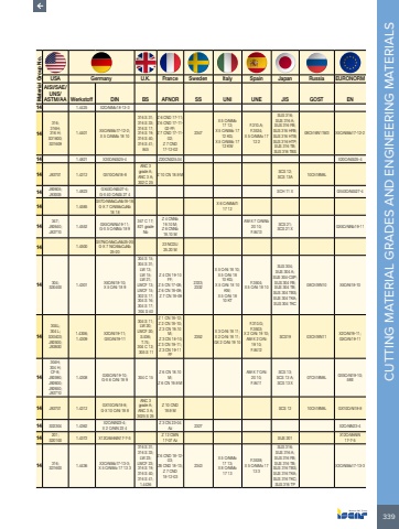 339CUTTING MATERIAL GRADES AND ENGINEERING MATERIALS Material Group No.USA Germany U.K. France Sweden Italy Spain Japan Russia EURONORMAISI/SAE/UNS/ASTM/AA Werkstoff DIN BS AFNOR SS UNI UNE JIS GOST EN14 1.4425 X2CrNiMo18-13-314316;316H;316 H;S31600;S316091.4401 X5CrNiMo17-12-2;X 5 CrNiMo 18 10316 S 31;316 S 33;316 S 17;316 S 19;316 S 40;316 S 41;845Z 6 CND 17-11;Z 6 CND 17-11-02-FF;Z 7 CND 17-11-02;Z 7 CND 17-12-022347X 5 CrNiMo 17 12;X 5 CrNiMo 17 12 KG;X 5 CrNiMo 17 12 KWF.310.A;F.3534;X 5 CrNiMo 17 12 2SUS 316;SUS 316 A;SUS 316 FB;SUS 316 HFB;SUS 316 HTB;SUS 316 HTP;SUS 316 TB;SUS 316 TBS08Ch16N11M3 X5CrNiMo17-12-214 1.4821 X20CrNiSi25-4 Z20CNS25.04 X20CrNiSi25-414 J92701 1.4312 GX10CrNi18-8ANC 3 grade A;ANC 3 A;302 C 25Z 10 CN 18.9 M SCS 12;SCS 13A 10Ch18N9L14 J92605;J93005 1.4823 GX40CrNiSi27-4;G-X 40 CrNiSi 27 4 SCH 11 X GX40CrNiSi27-414 1.4585GX7CrNiMoCuNb18-18;G-X 7 CrNiMoCuNb 18 18X 6 CrNiMoTi 17 1214347;J92640;J827101.4552 GX5CrNiNb19-11;G-X 5 CrNiNb 18 9347 C 17;821 grade NbZ 4 CNNb 19.10 M;Z 6 CNNb 18.10 MAM-X 7 CrNiNb 20 10;F.8413SCS 21;SCS 21 X GX5CrNiNb19-1114 1.4500GX7NiCrMoCuNb25-20;G-X 7 NiCrMoCuNb 25-2023 NCDU 25.20 M14 304;S30400 1.4301 X5CrNi18-10;X 5 CrNi 18 9304 S 15;304 S 31;LW 13;LW 15;LW 21;LWCF 13;LWCF 15;302 S 17;304 S 16;304 S 17;304 S 40Z 4 CN 19-10 FF;Z 5 CN 17-08;Z 6 CN 18-09; Z 7 CN 18-092333;2332X 5 CrNi 18 10;X 5 CrNi 18 10 KG;X 5 CrNi 18 10 KW;X 5 CrNi 18 10 KTF.3504;X 5 CrNi 18 10SUS 304;SUS 304 A;SUS 304-CSP;SUS 304 FB;SUS 304 TB;SUS 304 TBS;SUS 304 TKA;SUS 304 TKC08Ch18N10 X5CrNi18-1014304L;304 L;S30403;J92500;J926001.4306;1.4309X2CrNi19-11;GXCrNi19-11304 S 11;LW 20;LWCF 20;S.536;T.74;304 C 12; 305 S 11Z 1 CN 18-12;Z 2 CN 18-10;Z 3 CN 19.10 M; Z 3 CN 18-10;Z 3 CN 19-11;Z 3 CN 19-11 FF2352X 3 CrNi 18 11;X 2 CrNi 18 11;GX 2 CrNi 19 10F.310.G;F.3503;X 2 CrNi 19 10;AM-X 2 CrNi 19 10;F.8412SCS19 03Ch18N11 X2CrNi19-11;GXCrNi19-1114304H;304 H;CF-8;J92590;J92600;J92650;J927101.4308 GX5CrNi19-10;G-X 6 CrNi 18 9 304 C 15Z 6 CN 18.10 M;Z 6 CN 19.9 MAM-X 7 CrNi 20 10;F.8411SCS 13;SCS 13 A;SCS 13 X07Ch18N9L GX5CrNi19-10;58E14 J92701 1.4312 GX10CrNi18-8;G-X 10 CrNi 18 8ANC 3 grade A;ANC 3 A;3025 S 25Z 10 CND 18.9 M SCS 12 10Ch18N9L GX10CrNi18-814 S32304 1.4362 X2CrNiN23-4;X 2 CrNiN 23 4Z 3 CN 23-04 Az 2327 X2CrNiN23-414 201;S20100 1.4372 X12CrMnNiN17-7-5 Z 12 CMN 17-07 Az SUS 201 X12CrMnNiN 17-7-514 316;S31600 1.4436 X3CrNiMo17-13-3;X 5 CrNiMo 17 13 3316 S 31;316 S 33;LW 23;LWCF 23;316 S 19;316 S 40;316 S 41;1.4436Z 6 CND 18-12-03;Z6 CND 18-13;Z 7 CND 18-12-032343X 5 CrNiMo 17 13;X 8 CrNiMo 17 13F.3538;X 5 CrNiMo 17 13 3SUS 316;SUS 316 A;SUS 316 FB;SUS 316 TB;SUS 316 TBS;SUS 316 TKA;SUS 316 TKC;SUS 316 TPX3CrNiMo17-13-3
