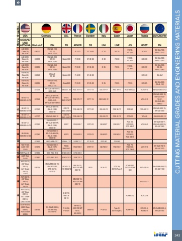343CUTTING MATERIAL GRADES AND ENGINEERING MATERIALS Material Group No.USA Germany U.K. France Sweden Italy Spain Japan Russia EURONORMAISI/SAE/UNS/ASTM/AA Werkstoff DIN BS AFNOR SS UNI UNE JIS GOST EN15A48-20 B;Class 20;No 20 B0.6010EN-GJL-100;GG 10;EN-JL 1010Ft 10 D 01 10-00 G 10 FG 10 FC 10;FC 100 SCh10 EN-GJL-100;EN-JL 101016A48-45 B;Class 45;No 45 B0.6030EN-GJL-300;GG 30;EN-JL 1050Grade 300 Ft 30 D 01 30-00 G 30 FG 30 FC 30;FC 300 SCh 30 EN-GJL-300;EN-JL 105016A48-50 B;Class 50;No 50 B0.6035EN-GJL-350;GG 35;EN-JL 1060Grade 350 Ft 35 D 01 35-00 G 35 FG 35 FC 35;FC350 SCh 35EN-GJL-350;GG 35;EN-JL 106016A48-60 B;Class 60;No 60 B0.6040 EN-JLZ;GG 40 Grade 400 Ft 40 D 01 40-00 SCh 40 EN-JLZ16A48-40 B;Class 40;No 40 B0.6025EN-GJL-250;GG 25;EN-JL 140Grade260 Ft 25 D 01 25-00 G 25 FG 25 FC 25 SCh 25 EN-GJL-250;EN-JL 14017 0.7033 EN-GJS-350-22-LT;GGG 35.3 350/22 L 40 FGS 370-/17 0717-15 GS 370-17 FNG 38-17 FCD 350-22L VCh42-12 EN-GJS-350-22-LT17 60-40-18;A536 60-40-18 0.7043EN-GJS-400-18;EN-GJS-400-18-LT;GGG-40.3; EN-GJS-400-18A-LT370/7;SNG 370/17 FGS 370-17 0717-15 GSO 400-12 VCh 42-2EN-GJS-400-18;EN-GJS-400-18-LT; EN-GJS-400-18A-LT17 60-40-18;A536 60-40-18 0.7040EN-GJS-400-15;EN-JS 1030;GGG-40420/12;SNG 420/12 FCS 400-12 0717-02 GS 400-12 FGE 38-17 FCD 40 VCh 42-12 EN-GJS-400-15;EN-JS 103017 65-45-12;A536 65-45-12 5.3107 EN-GJS-450-10 450/10;SNG 450/10 FGS 450-10 GS 400-12 FGE 42-12 FCD450 VCh 45 EN-GJS-450-1018 65-45-12;A536 65-45-12 0.7050EN-GJS-500-7;EN-GJS-500-7A;EN-JS 1050;GGG-50500/7 FGS 500-7 0727-02 GS 500/7 FGE 50-7FCD 50;FCD 500;FCD 500-7VCh 50-2EN-GJS-500-7;EN-GJS-500-7A;EN-JS 105018 80-55-06;A536 80-55-06 0.7060EN-GJS-600-3;EN-GJS-600-3A;EN-JS 1060;GGG-60600/3 FGS 600-3 0732-03 GS 600/3 FGE 60-2FCD 60;FCD 600;FCD 600-318 0.7652 GGG-NiMn 13 7 S-NiMn 13 7 S-NM 13 7 07 32-03 GGG 60 GGG 6018100-70-03;A536 100-70-030.7070EN-GJS-700-2;EN-JS 1070;GGG-70700/2;SNG700/2 FGS 700-2 0737-01 GS 700-2 FGE 70-2FCD 70;FCD 700;FCD 700-2VCh 70-2 EN-GJS-700-2;EN-JS 107018 A439 Type D-2 0.7660 GGG-NiCr 20 2 S-NiCr 20 2 S-NC 20-218 A439 Type D-2 B 0.7661 GGG-NiCr 20 3 S-NiCr 20 3 S-NC 20 319A47-32510;A47 Class 32510;A47 Grade 32510; 325100.8135EN-GJMB-350-10;EN-JM 1130;GTS-35-10;GTS-35B 340/12;310 B340/12MN 35-10;A32-702 MN 350-100810 B 35-10 GTS 35;36114 Type AFCMB 340;G5703 FCMB 340KCh 35-10 EN-GJMB-350-10;EN-JM 113019A47-35018, A47 Class 35018;A47 Grade 35018MN 380-18;A32-702 MN 380-18KCh 37-1219A47-22010;A47 Class 22010;A47 Grade 22010; UNS F22200B 32-10;6681 B 32-10FCMB 310 KCh 33-820A220-50005;A220 Class 50005;A220 Grade 500050.8155EN-GJMB-550-4;EN-JM1160;GTS-55-04P 55-04;P 510/4MP 60-3;A32-703 MP 60-3;Mn 550-40856-00 P 55-04 Type C;36116 Type C FCMP 540 KCh 55-4;KCh60-3EN-GJMB-550-4;EN-JM1160